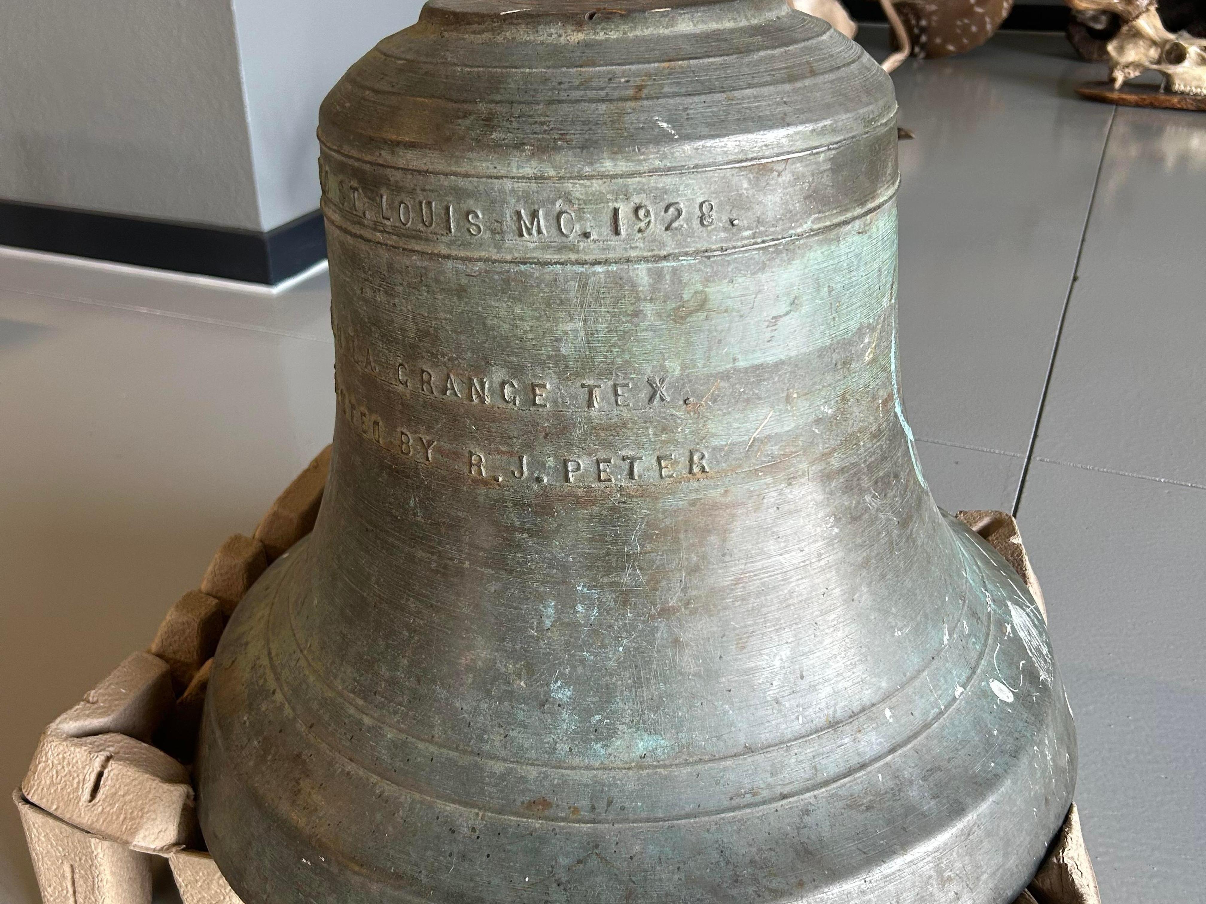 A bell from 1928 found at Prestige Auto and Metal Recycling yard in Houston, Texas during a visit by BMRA service member, Newell Recycling Equipment.
